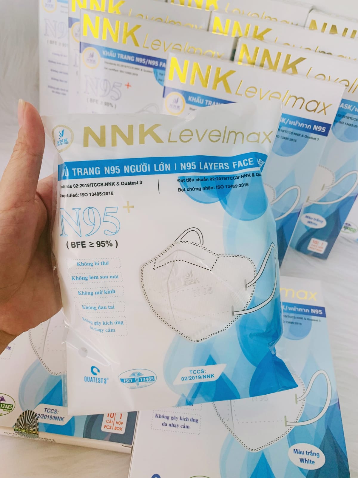NNK N95+ LEVELMAX ISO Premium Medical Mask.ISO Certified.ISO 9001 : 2015.ISO 13485 : 2016.Standard VN 8389 - 1 : 2010.CE Certified.BFE>95%Quatest 310 embossed mask per box.Expiry Date: 2026 onwards.